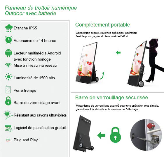 Le panneau LCD haute luminosité utilisé dans cet affichage est jusqu’à trois fois plus lumineux qu’une télévision domestique, ce qui le rend idéal pour les espaces extérieurs.